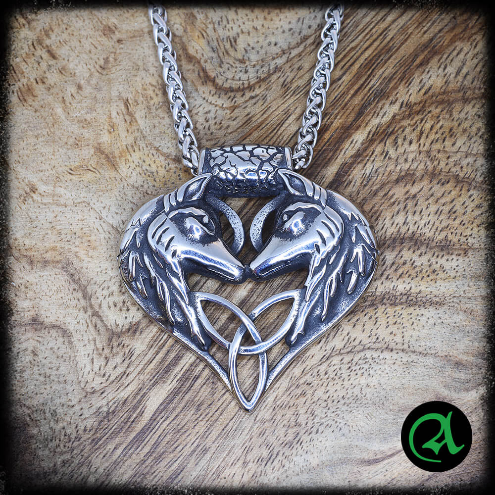Obesek VOLČJE SRCE s podobo dveh volkov v srcu, ki je izdelan iz nerjavečega jekla.