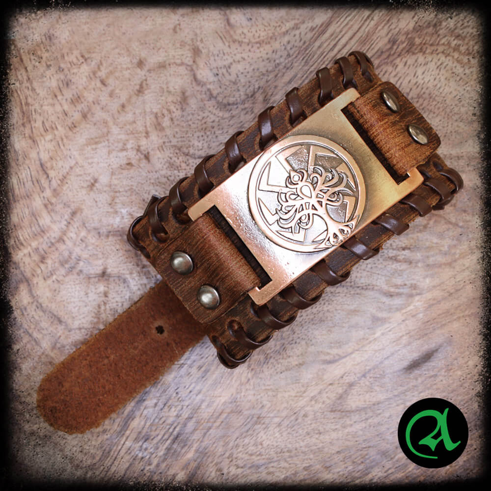 Rjava usnjena zapestnica KOLOVRAT – DREVO ŽIVLJENJA iz pravega usnja in nastavljivim zapenjanjem na zaponko (5 lukenj) in kovinsko ploščico v bakreni barvi.
