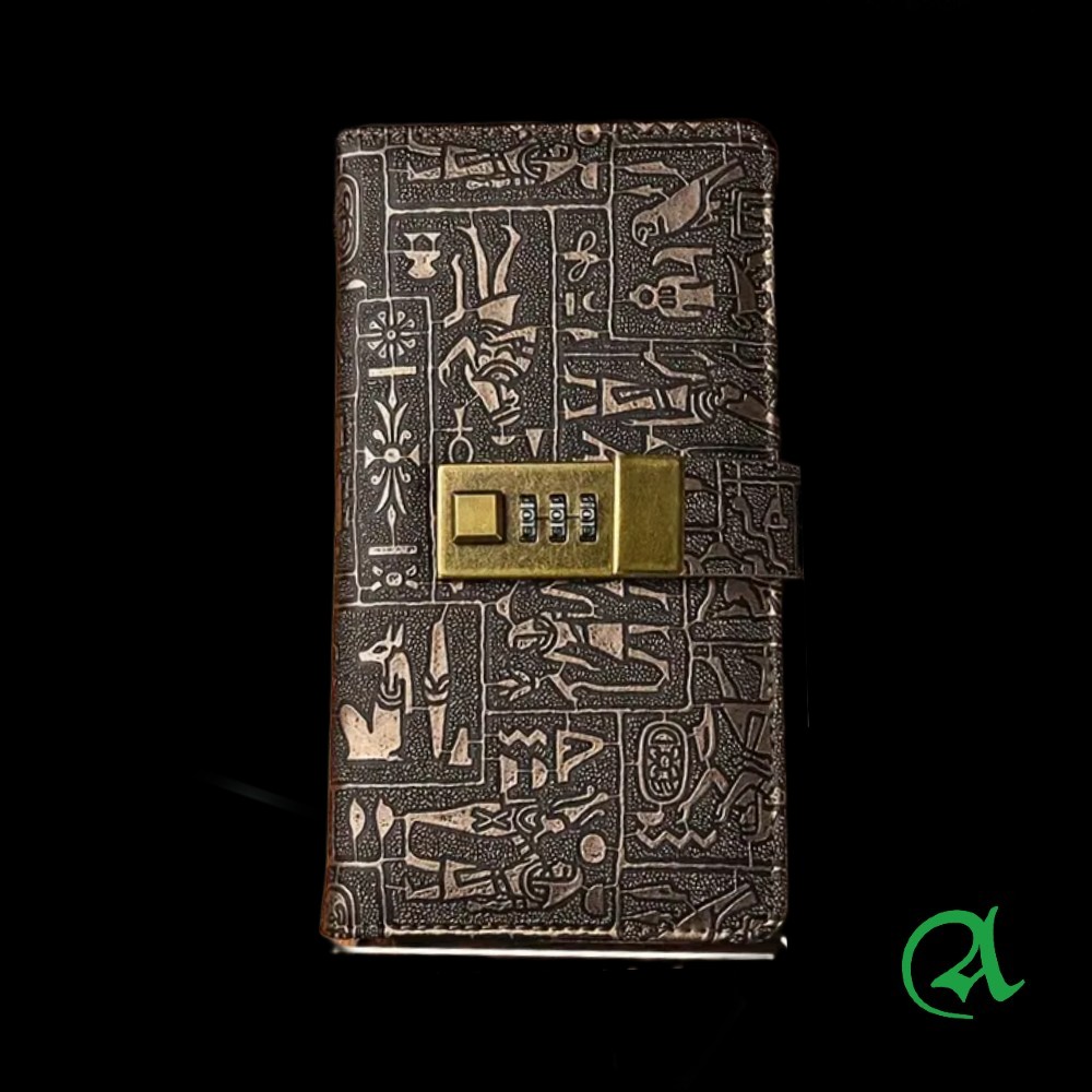 Usnjen blok / zvezek / beležka / dnevnik / notesnik s kombinacijsko ključavnico R N KMT z motivom hieroglifov v velikosti 18,5 x 10 cm.